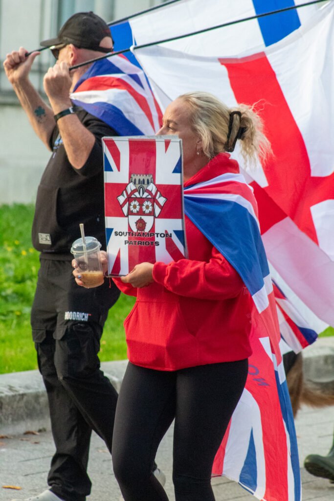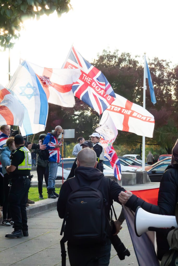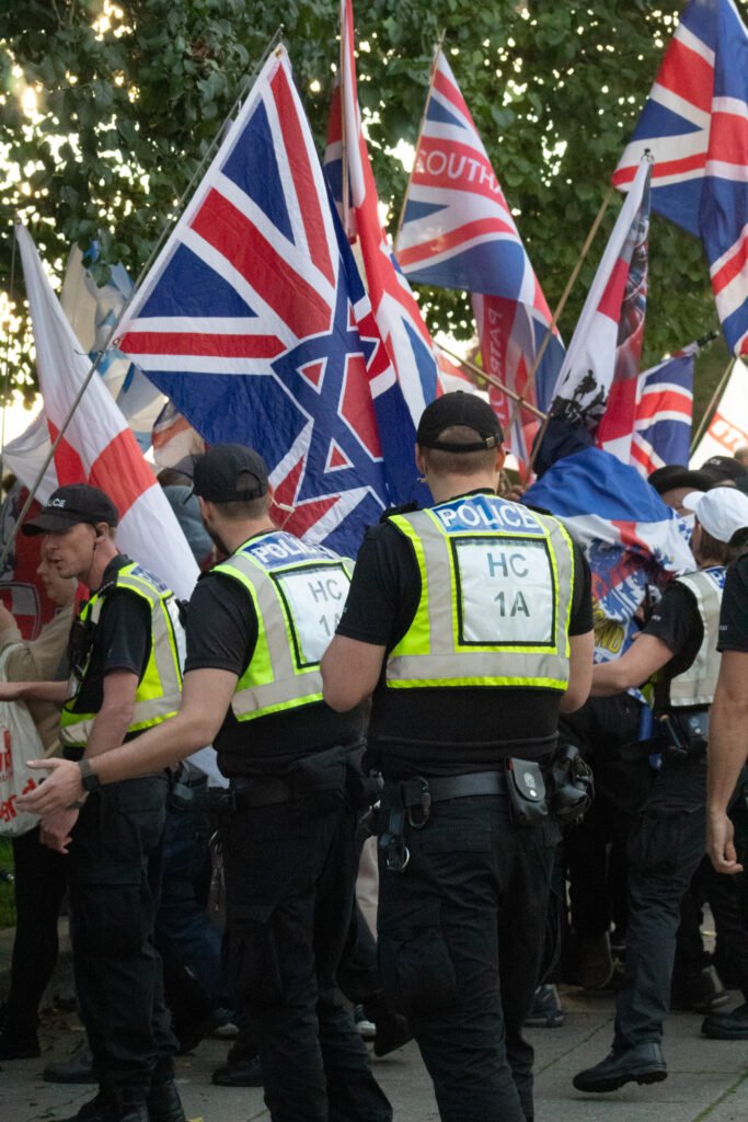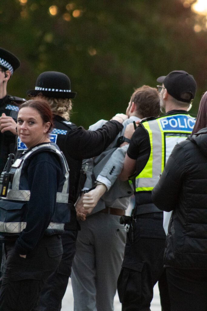 Tensions between the two sides escalated throughout the evening. Witnesses said a man stood amongst the anti-arms protest attempted to provoke pro-UK supporters several times before lunging at one of them as the event drew to a close. Hampshire Police quickly intervened, arresting the man and escorting him from the scene to be taken away in a Police van.