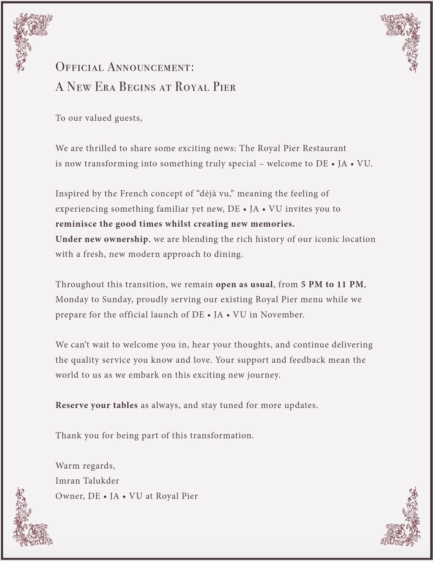 In an email to patrons and on the Kutis social media platforms, Imran Talukder expressed his enthusiasm for the transformation, stating, “We are thrilled to share some exciting news: The Royal Pier Restaurant is now transforming into something truly special. Welcome to DE • JA • VU. Inspired by the French concept of ‘déjà vu,’ meaning the feeling of experiencing something familiar yet new. DE • JA • VU invites you to reminisce the good times whilst creating new memories.”