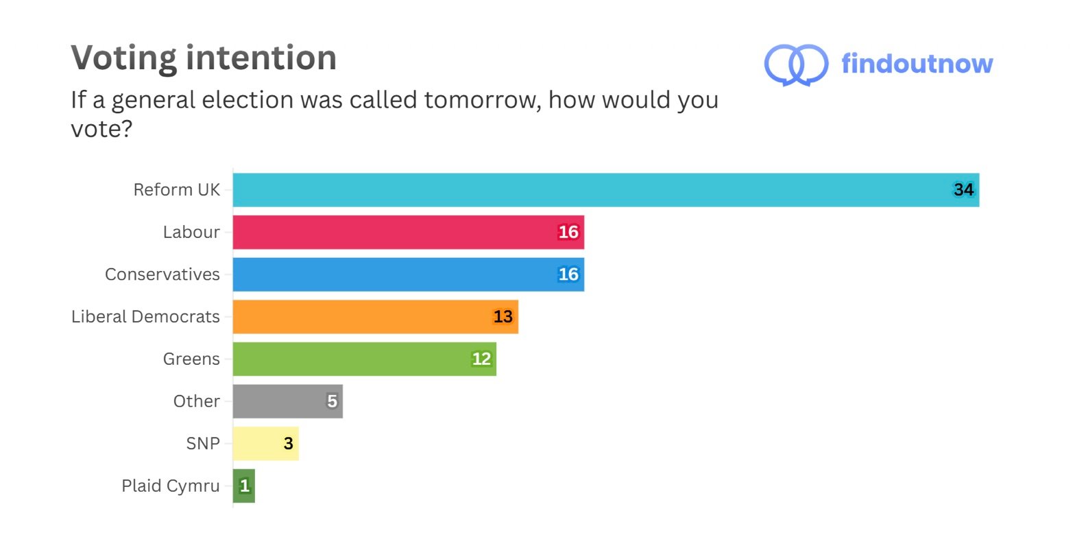 A poll released this week by Find Out Now placed Labour at just 16 per cent of the vote—its lowest level since its landslide victory in July 2024. The figures, from a Find Out Now survey of 4,795 adults on September 17 and 18, showed Labour and the Conservatives tied on 16 per cent, with Labour down three points and the Tories flatlining. Reform UK, meanwhile, soared ahead on 34 per cent, cementing its position as the country’s most popular party.
