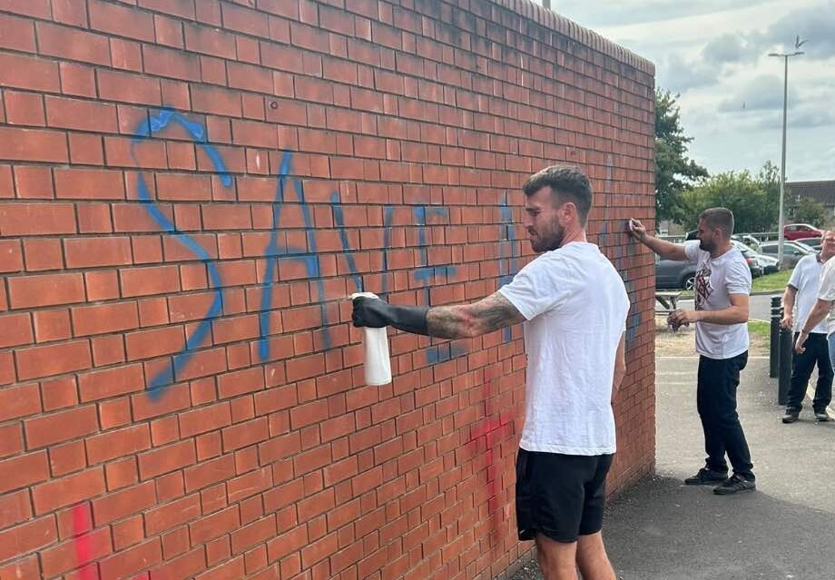 Members of the Southampton Patriots spent Sunday scrubbing graffiti from the Mountbatten pub in Southampton and Sainsbury’s in Lordshill, distancing themselves from recent acts of vandalism.